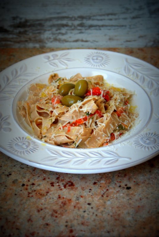 Makaron wstążki orkiszowe w pomidorach,koperku, śmietanie